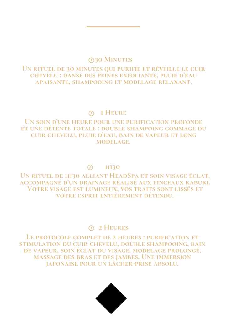 Le Head Spa est un rituel de bien-être inspiré des traditions japonaises, dédié au cuir chevelu et à la relaxation profonde.